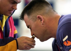 06 Aug 2000: Chris Duthie of South Australia smells some smelling salts before attempting to lift 125 kg during the Snatch competition of the mens 94kg class at the Telstra Australian Weightlifting Championships at the South Bank Piazza in Brisbane, Australia. DIGITAL IMAGE. Mandatory Credit: Darren England/ALLSPORT